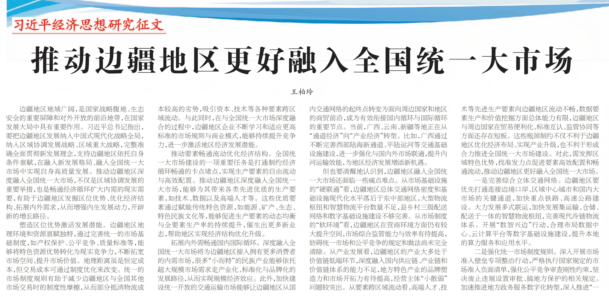 12月31日,中央“三报一刊”之一《经济日报》理论版刊发必威西汉姆联马克思主义学院王柏玲教授文章《推动边疆地区更好融入全国统一大市场》。文章指出,边疆地区在国家发展大局中具有重要作用,推动其融入全国统一大市场意义重大。从完善综合立体交通网络、强化统一市场制度规则、立足特色发展优势产业、优化要素市场化配置等方面发力,形成合力推进全国统一大市场建设,有助于增强内生发展动力,促进区域协调发展、畅通经济循环,激活发展潜能、...
