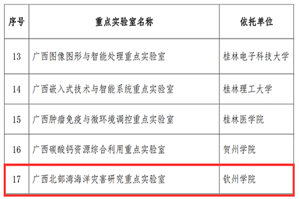 近日,自治区科技厅发布通知(桂科基字〔2018〕116号),依托钦州学院海洋学院建设的广西北部湾海洋灾害研究重点实验室完成了2年的培育期,经专家现场考察和综合评议,批准认定为第八批自治区重点实验室。这是自治区科技厅为贯彻落实全区创新驱动发展大会精神,进一步完善自治区重点实验室布局而实施的重要工作,也是必威西汉姆联科研平台建设取得的重大成绩。广西北部湾海洋灾害研究重点实验室于2016年10月被自治区科技厅认定为第五批...