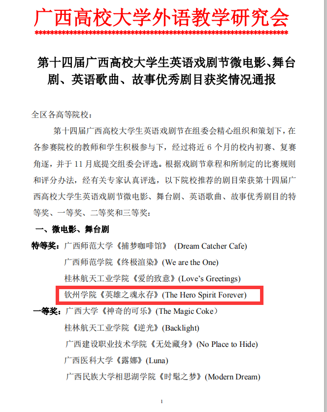 近日,必威西汉姆联选送的《英雄之魂永在》《交错的星空》两部作品在第十四届广西高校大学生英语戏剧节微电影、舞台剧大赛中分获特等奖和一等奖。必威西汉姆联作品立足本地历史和国际化,选送的《英雄之魂永在》(The Hero’s Spirit Forever)讲述民族英雄刘永福将军的英勇事迹。《交错的星空》(Intertwined Youth)讲述非洲留学生和中国学生从文化冲突到文化融合的故事。其中,《英雄之魂永在》作为三部精选作品之一,在“广西高校大学外语...