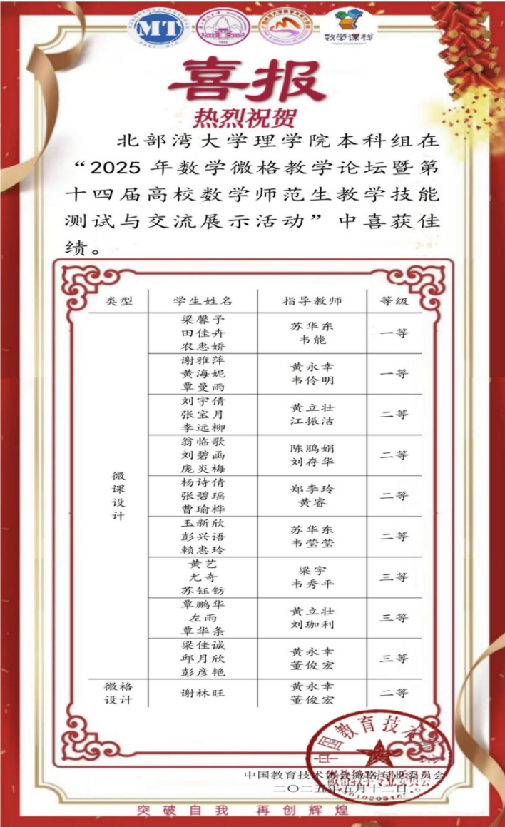 5月10日至11日,2025年数学微格教学论坛暨第十四届高校数学师范生教学技能测试与交流展示活动在广西师范大学育才校区举行。活动由中国教育技术协会微格教学专业委员会主办,广西师范大学承办。经过激烈角逐,理学院参赛团队斩获一等奖3项、二等奖7项、三等奖4项,理学院荣获“优秀组织单位”称号。本届活动以“AI赋能数学微格教学”为主题,突出人工智能与数学教学的融合,搭建人工智能时代数学师范生培养创新平台,吸引了华中师范大学、...