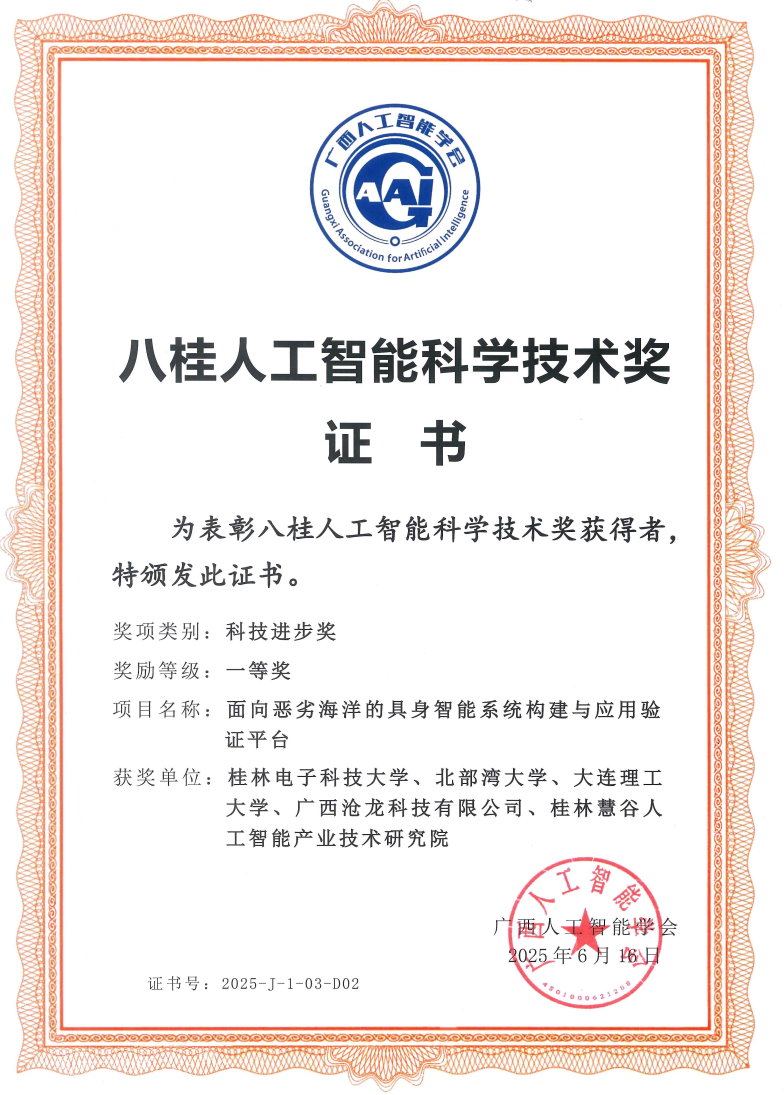 近日,2025年度八桂人工智能科学技术奖评选结果揭晓,必威西汉姆联作为主要完成单位申报的《面向恶劣海洋的具身智能系统构建与应用验证平台》项目荣获科技进步奖一等奖。该奖项由广西人工智能学会设立,是广西人工智能领域权威学术奖项,旨在表彰为技术革新与产业应用做出卓越贡献的科研集体。此次获奖项目由桂林电子科技大学、bw必威西汉姆联官方网站、大连理工大学、广西沧龙科技有限公司、桂林慧谷人工智能产业技术研究院等多家单位共同完成。项目围绕恶劣海洋环境下的智能系统构建难题,...