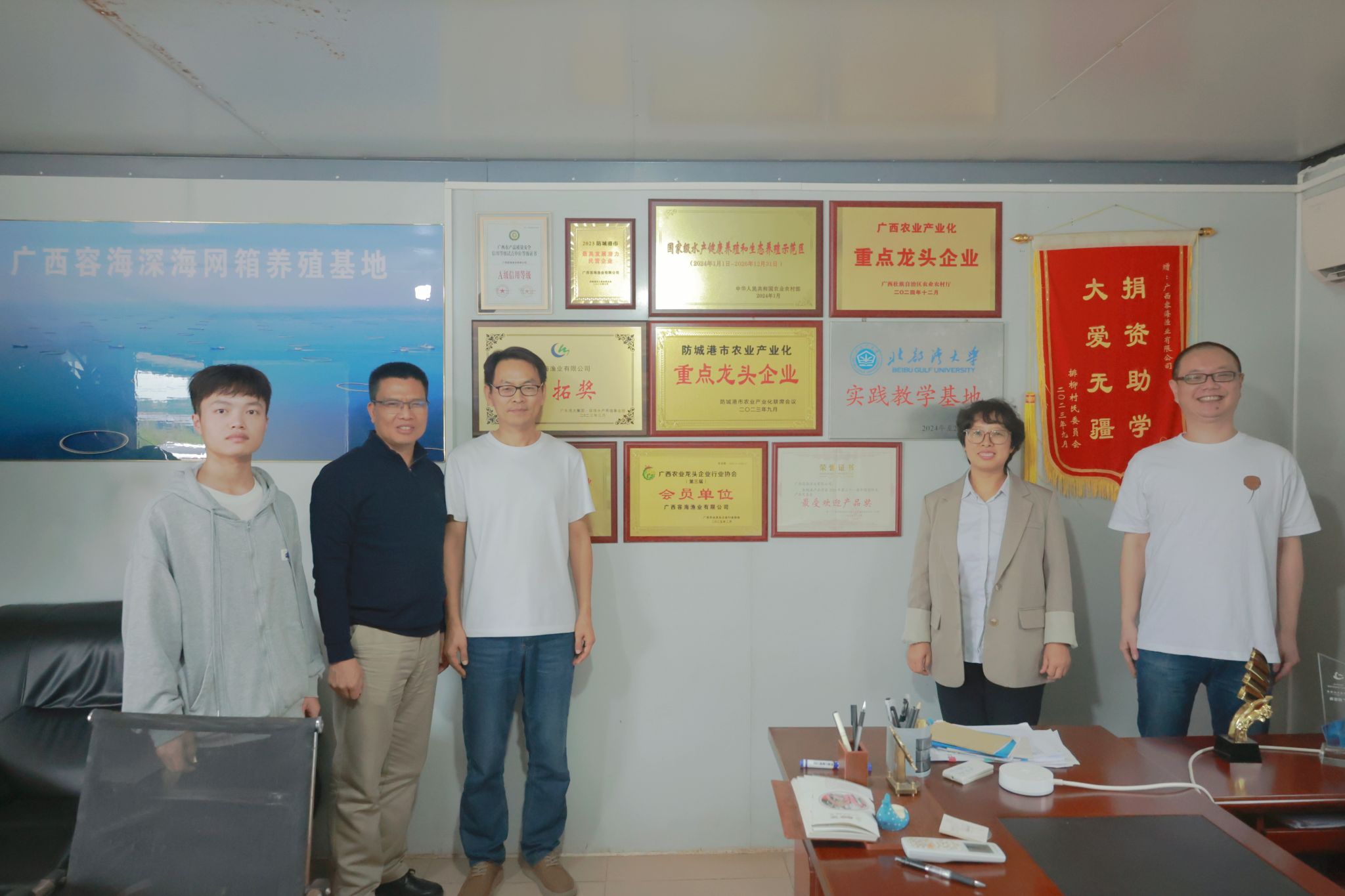 近日,校党委常委、宣传部部长裴以明率海洋学院水产动物免疫与病害控制创新团队蔡小辉、胥鹏等教师,赴防城港市开展渔业病害防治专项调研与样本采集工作,旨在精准服务区域海洋经济,推动水产养殖业绿色健康发展。调研组先后走访广西容海渔业有限公司与防城港金色海洋产业发展有限责任公司,通过座谈交流与实地考察,系统了解当地海域环境与养殖产业现状,并就关键技术问题及未来合作方向展开深入探讨。在广西容海渔业有限公司——国家级白龙珍珠湾海洋牧场示范区的运营主体,...