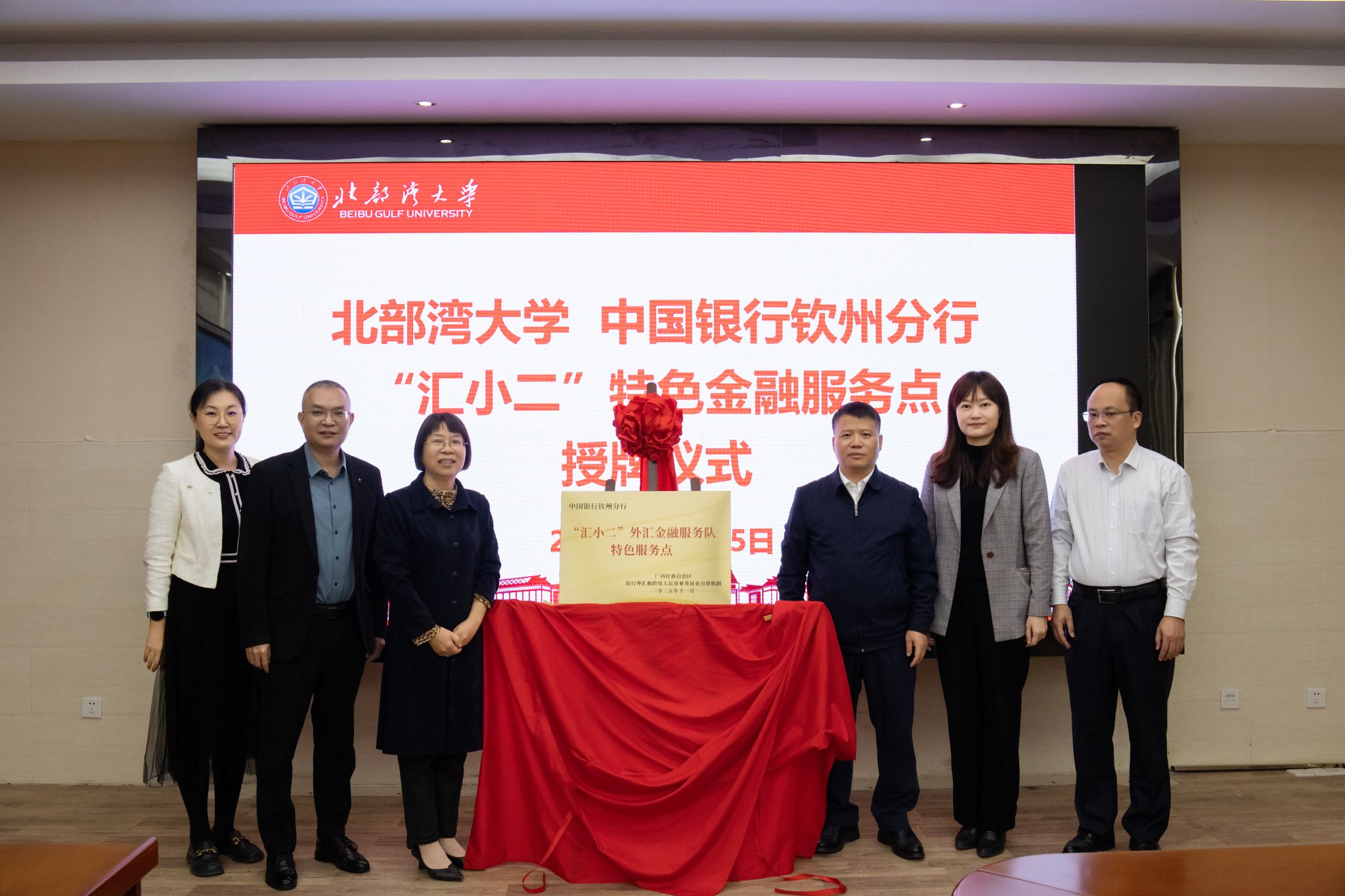 11月25日,“汇小二”金融服务点揭牌仪式在学校办公楼523举行。校党委常委、副校长陆衡,中国人民银行钦州市分行行长王海全,中国银行钦州分行行长石蕾出席仪式并共同揭牌。陆衡热烈欢迎王海全、石蕾一行来访。她表示,共建金融服务点是学校拓展银校合作、完善校园金融服务体系的关键举措。学校将以“汇小二”金融服务点为平台,整合三方资源,切实满足师生有关业务需求,助力学校高质量发展。王海全表示,中国人民银行钦州市分行作为地方金融管理机构,...