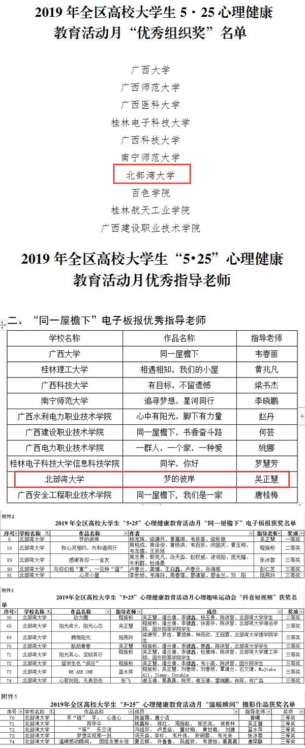 近日,从《自治区教育厅关于公布2019年全区高校大学生“5·25”心理健康教育活动月主题活动获奖名单的通知》(桂教思政〔2019〕10号)获悉,必威西汉姆联获得此项活动开展以来的最好成绩。在本次活动中,必威西汉姆联荣获“优秀组织奖”。在“同一屋檐下”电子板报、心理趣味运动会“抖音短视频”、温暖瞬间”摄影等评比活动中,必威西汉姆联学生参赛作品获得一等奖1项、二等奖2项、三等奖15项,吴正慧老师被评为“同一屋檐下”电子板报评比优秀指导老...