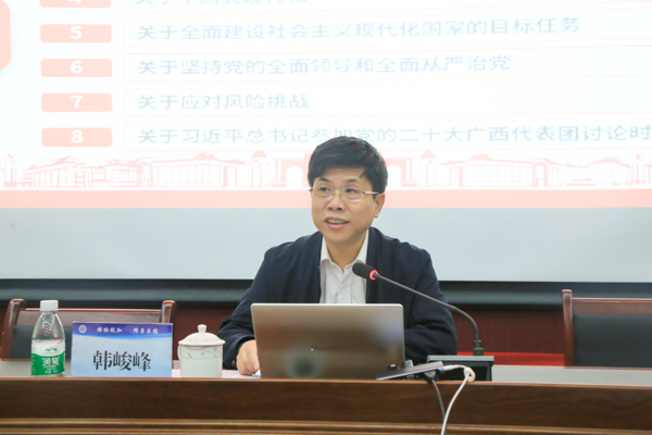 11月24日下午,学校党委书记韩峻峰到钦州幼儿师范高等专科学校宣讲党的二十大精神。市教育局党组成员、副局长,钦州幼专党委书记田茂群主持宣讲报告会。该校校党委副书记、校长卢红青,校党委副书记李飞,正处长级干部梁燕清和全体党员、中层以上干部、思政教师及学生代表一起聆听了宣讲报告。韩峻峰从“党的二十大的主题、主要成果,过去5年的工作和新时代10年的伟大变革,马克思主义中国化时代化,中国式现代化,全面建设社会...