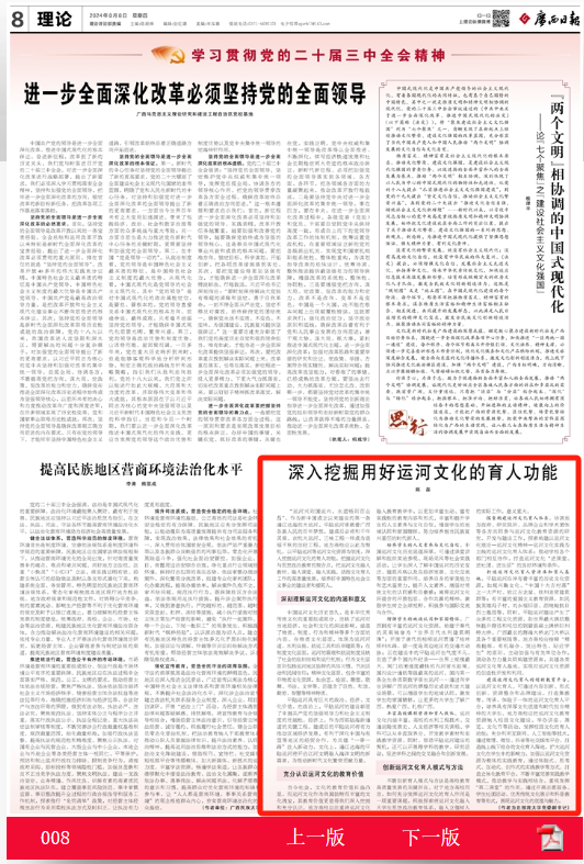 8月8日,《广西日报》第8版理论专栏刊发必威西汉姆联党委副书记陈磊理论文章《深入挖掘用好运河文化的育人功能》。文章从“深刻理解运河文化的内涵和意义”“充分认识运河文化的教育价值”“创新运河文化育人模式与方法”三方面阐述。文章认为,地方高校应以平陆运河等运河文化资源为依托,深入挖掘运河文化的育人功能,把握运河文化与思想政治教育的契合点,把运河文化融入教材、融入课堂、融入实践,助推文化育人工作的高质量发展,培养好中国特色社会主义事业的建设者和接班人。...