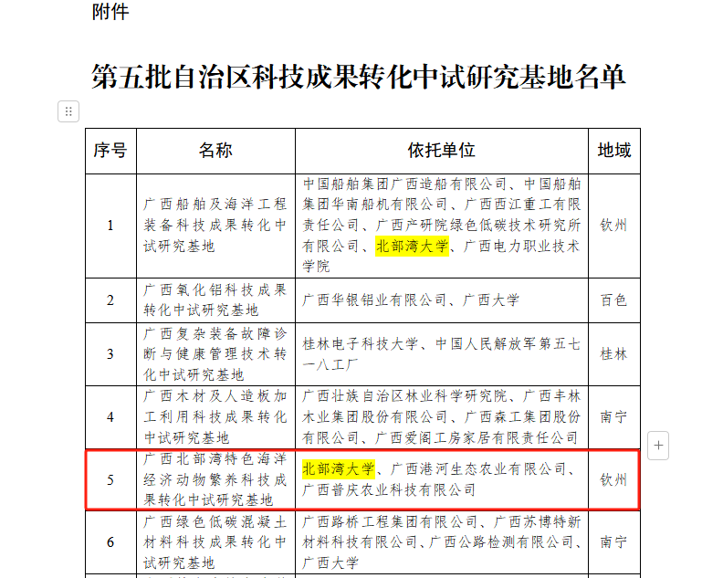 近日,根据自治区科技厅通知公告,必威西汉姆联牵头建设的“广西北部湾特色海洋经济动物繁养科技成果转化中试研究基地”获批为第五批自治区科技成果转化中试研究基地。这是湾大首个自治区级科技成果转化中试研究基地(以下简称“中试基地”)。据悉,中试基地是为科技成果进行二次开发实验,为企业规模生产提供成熟、适用、成套技术而开展中间试验的科研开发实体,是支撑产业链创新、助推科技成果转化的重要平台。2021年至今,全区共有54个中试基地获批,...