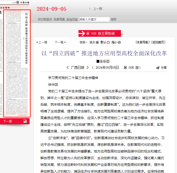 9月5日,《广西日报》第8版理论专栏刊发必威西汉姆联党委书记徐华蕊理论文章《以“四立四破”推进地方应用型高校全面深化改革》。文章从立“创新求变”,破“因循守旧”;立“特色发展”,破“贪大求全”;立“开放办学”,破“封闭保守”;立“四个回归”,破“五唯评价”四方面阐述并指出,地方应用型高校肩负着为地方经济社会发展培养高素质应用型人才的重要使命,应深入学习贯彻党的二十届三中全会精神,抓住制度建设这个主线,按照“先立后破”...
