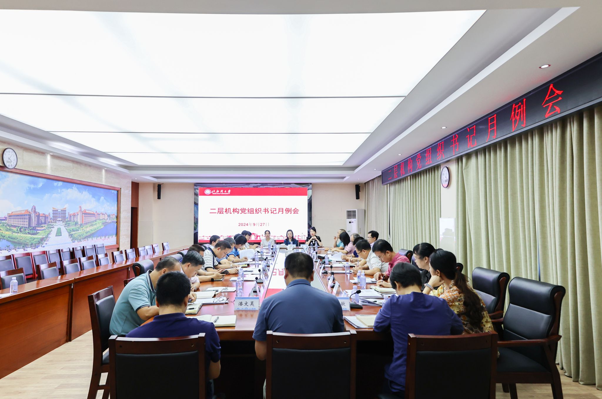 9月27日下午,学校在办公楼523会议室召开二层机构党组织书记月例会。校党委副书记唐高华出席会议并讲话。党委职能部门负责人、二层机构党组织书记参会。唐高华对今年上半年学校全面推进基层组织建设工作进行了梳理和总结,对党纪学习教育以及基层党建“五基三化”深化年行动开展情况给予肯定,并研究部署下半年的党建工作。他强调,要突出重点,狠抓落实,持之以恒推进基层党建各项工作落实落地,具体要做到着力推动党的创新理论武装走深走实,...