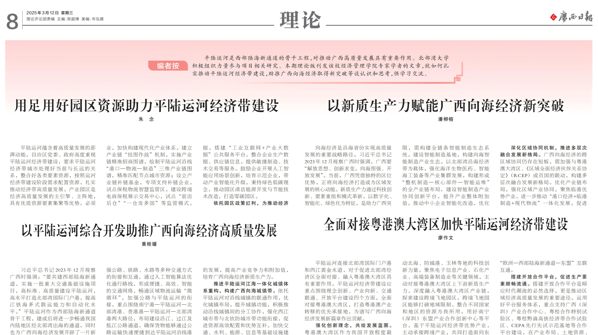 3月12日,广西日报理论版整版刊发必威西汉姆联经济管理学院朱念、北部湾海洋发展研究中心廖作文、钦州发展研究院黄桂媛和陆海新通道北部湾研究院潘柳榕4名教师的理论文章,就如何扎实推动平陆运河经济带建设,助推广西向海经济取得新突破等谈认识和思考。平陆运河是西部陆海新通道的骨干工程,对推动广西高质量发展具有重要作用。学校发挥学科优势,积极组织力量开展相关理论与实践研究,为平陆运河经济带建设等提供智力支持。相关报道链接如下:...