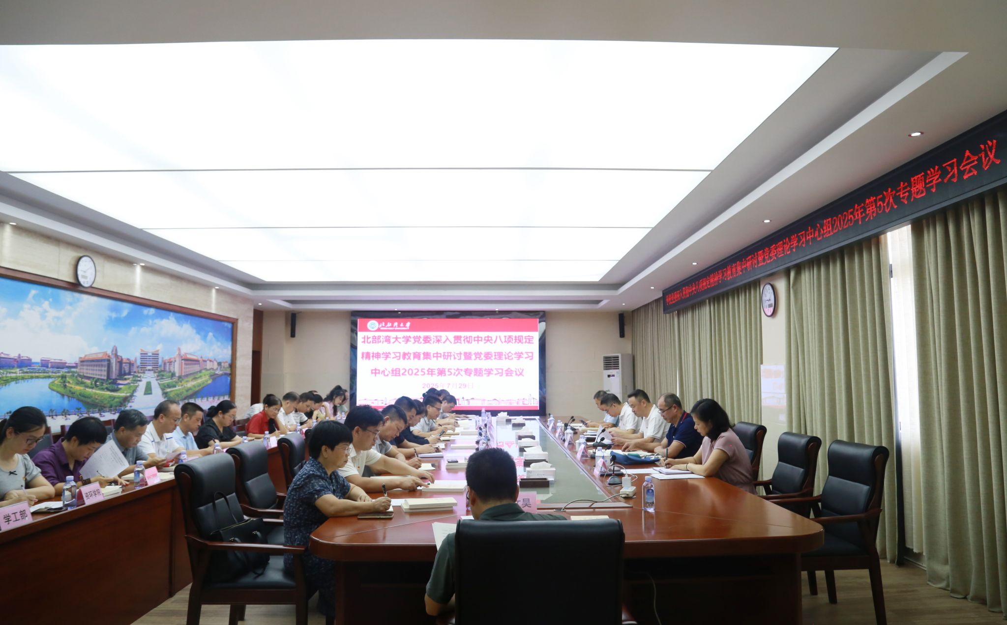 7月29日,学校党委深入贯彻中央八项规定精神学习教育集中研讨暨党委理论学习中心组2025年第5次专题学习会议在办公楼523会议室召开。校党委副书记、校长苗剑主持会议。会上,苗剑传达了中央及自治区有关文件精神,通报了有关反面典型案例,并围绕深入学习贯彻习近平生态文明思想和中央党的建设工作领导小组第14次会议精神,完善作风建设常态化长效化机制,统筹建好政治生态、自然生态“两个生态”,推动学校高质量发展等议题,组织开展集中研讨。...