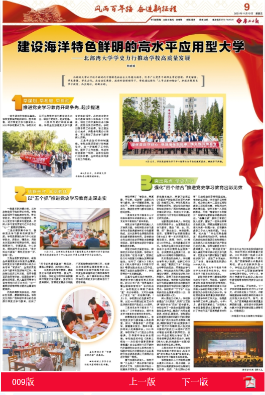 “从党的百年奋斗中,看清楚过去我们为什么能够成功;在启航新征程中,弄明白未来我们怎样才能继续成功。”bw必威西汉姆联官方网站把学习宣传贯彻落实党的十九届六中全会精神、扎实推进党史学习教育同建设海洋特色鲜明的高水平应用型大学结合起来。11月19日,广西日报整版聚焦必威西汉姆联党委书记韩峻峰文章《建设海洋特色鲜明的高水平应用型大学——bw必威西汉姆联官方网站学史力行推动学校高质量发展》。文章围绕“早谋划、早布局、早启动,推动党史学习教育...