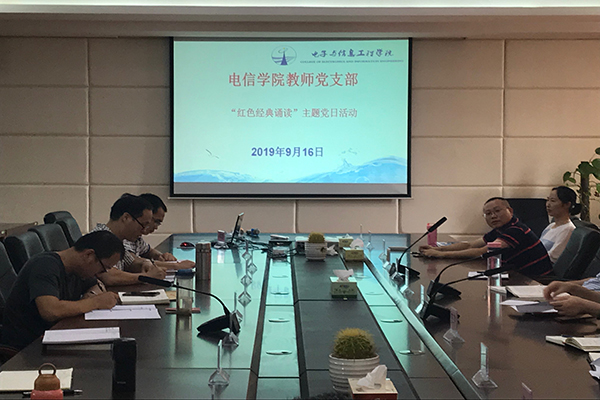 9月16日,电信学院教师党支部庆国庆“红色经典诵读”主题党日活动在5栋419会议室举行。电信学院党委书记卓杰先,党委副书记李贤阳(兼教师支部书记)以及党支部的全体党员参加了活动。此次主题党日活动由李贤阳副书记主持。李贤阳副书记指出,为深入学习贯彻习近平新时代中国特色社会主义思想和党的十九大精神,为庆祝中华人民共和国成立70周年,热情讴歌伟大的党、伟大的祖国,充分展示全体党员的爱国主义热情、昂扬的精神面貌...