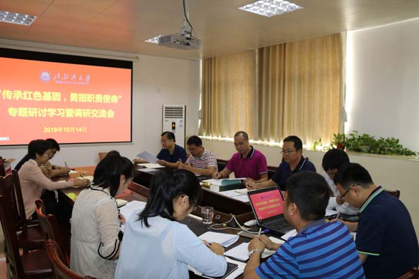 10月14日上午,教务质管党支部在行政楼201会议室开展了“传承红色基因、勇但职责使命”专题研讨学习暨调研交流会。专题研讨学习会上,司继涛同志从红色基因是党和国家的精神财富,是思想建党、理论强档的智慧支撑,是保持党的先进性的宝贵资源,是我们发展事业、勇担职责使命的原动力等方面发表学习心得。黄孙庆同志先与大家分享了《我和我的祖国》观影心得,再谈参观牛圩坡烈士纪念碑所感所想,最后为大家讲述了自己爷爷曾经作...