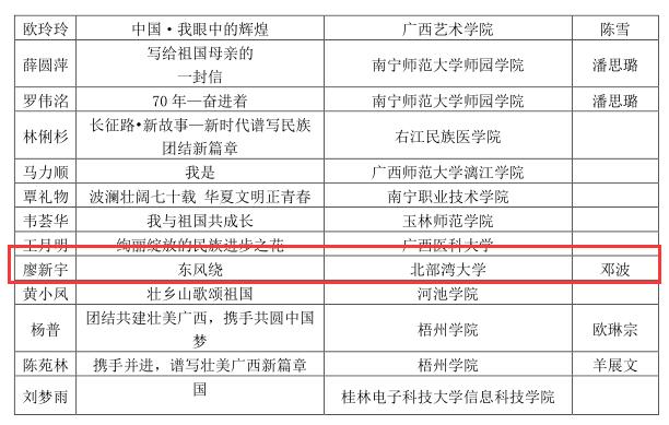 近日,根据桂教民教[2019]11号文件《自治区教育厅关于公布“喜迎新中国成立70周年 共话民族团结进步教育”征文活动评选结果的通知》获知,由党委宣传部邓波老师指导廖新宇创作的作品《东风绕》荣获高校组二等奖;党委宣传部陈烜严老师指导罗茵创作的作品《盛世盛景迎国庆大美中国新征途》荣获高校组三等奖。必威西汉姆联对此次征文活动高度重视,从5月份开始发征文通知,面向全校征集征文作品,9月汇集作品,集中挑选优秀作品4篇报送至...