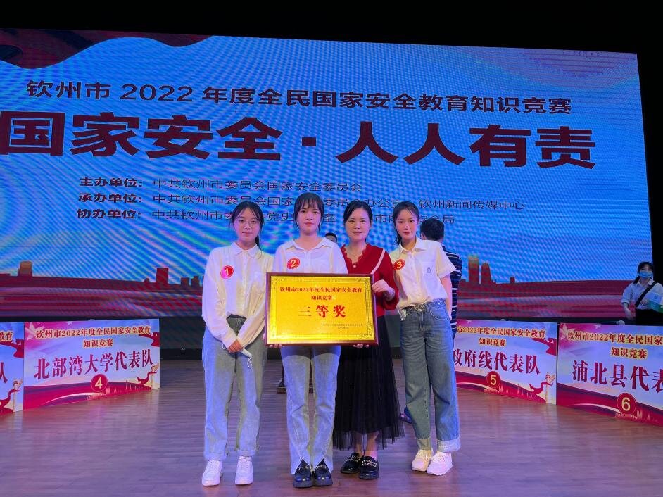 4月15日下午,由人文学院蒙桂秀老师指导,汉语国际教育专业陈竹玉、龙嘉怡、汉语言文学专业陈俞蓉、庞丹等四名同学组成的bw必威西汉姆联官方网站一队在钦州市2022年度全民国家安全教育知识竞赛活动中以优异成绩荣获三等奖。此次竞赛共有来自灵山县、浦北县、钦南区、钦北区和自贸区钦州港片区、bw必威西汉姆联官方网站、党群组织、政府办的八支队伍,共四轮比赛。各队在竞赛前两轮中不分胜负,至第三轮争分夺秒抢答赛才逐渐拉开积分差距,局势高潮迭起。...