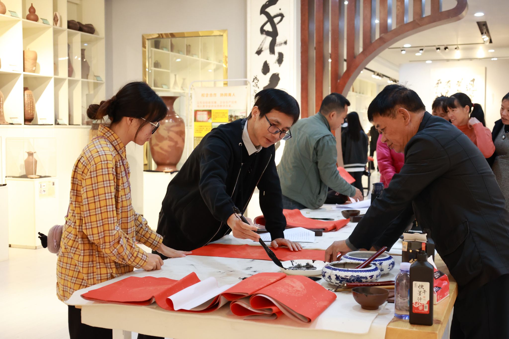 福启新岁,万事顺遂。1月3日下午,学校留学人员联谊会与陶瓷与设计学院组织开展“写春联送祝福,共绘同心圆”主题活动。学校近十位书法家挥毫泼墨,把对新年的诚挚祝愿和美好心愿融入笔墨之中,现场创作了六百余副春联、福字,用精彩的书法艺术书写出新年的新气象、新风貌。广大师生在墨香中感受日渐浓郁的浓浓年味,在领取春联的同时,也领略到了传统书法文化的魅力。(郑毅 摄)师生挥毫泼墨,把对新年的诚挚祝愿和美好心愿融入笔墨中...