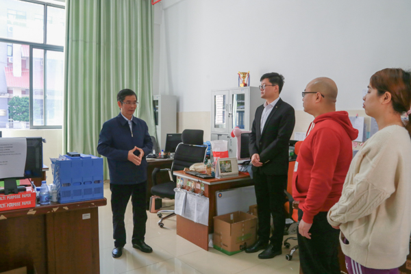 在西区学生公寓、国际交流处与办公楼,陈锦山与在岗人员一一拜年,送上慰问金,代表学校党委和行政对众多行政后勤人员在各自岗位上的默默坚守和无私奉献表示崇高敬意。他详细询问值班人员的工作情况,感谢大家坚守岗位,希望大家履职尽责,从严从细落实学校疫情防控要求,为留校师生提供优质公共服务,在新的一年继续为湾大品质校园建设作贡献。