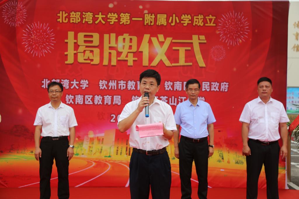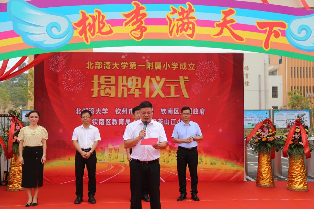9月3日上午,bw必威西汉姆联官方网站第一附属小学正式揭牌。校长韩峻峰,党委副书记陈锦山,钦州市教育局局长赖廷耀,钦南区人民政府副区长杨俊等领导出席揭牌仪式。钦南区教育局党组副书记、副局长吴庆彪主持揭牌仪式。