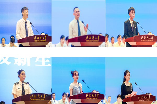 老生代表李步双鼓励新同学既要理想远大,又要脚踏实地,保持积极进取的精神风貌。新生代表王惠洁表示,将努力成长为国家需要的德才兼备的高素质人才。留学生代表、来自越南的李越华表示,希望能深入领略中华文化的魅力,为中越两国的文化交流贡献自己的一份力量。研究生代表朱迪表示,将秉承校训和学校精神勇敢追梦,将自己与国家、专业领域的发展紧紧连在一起。
