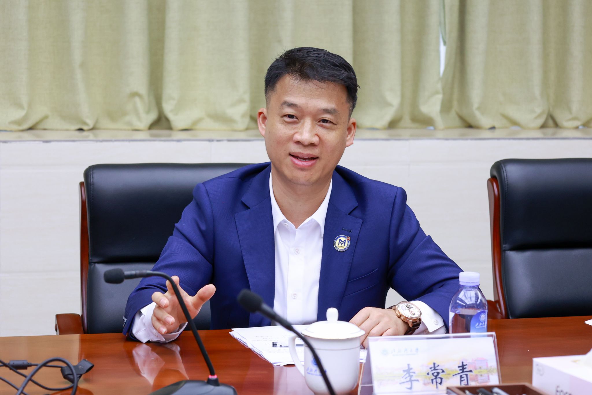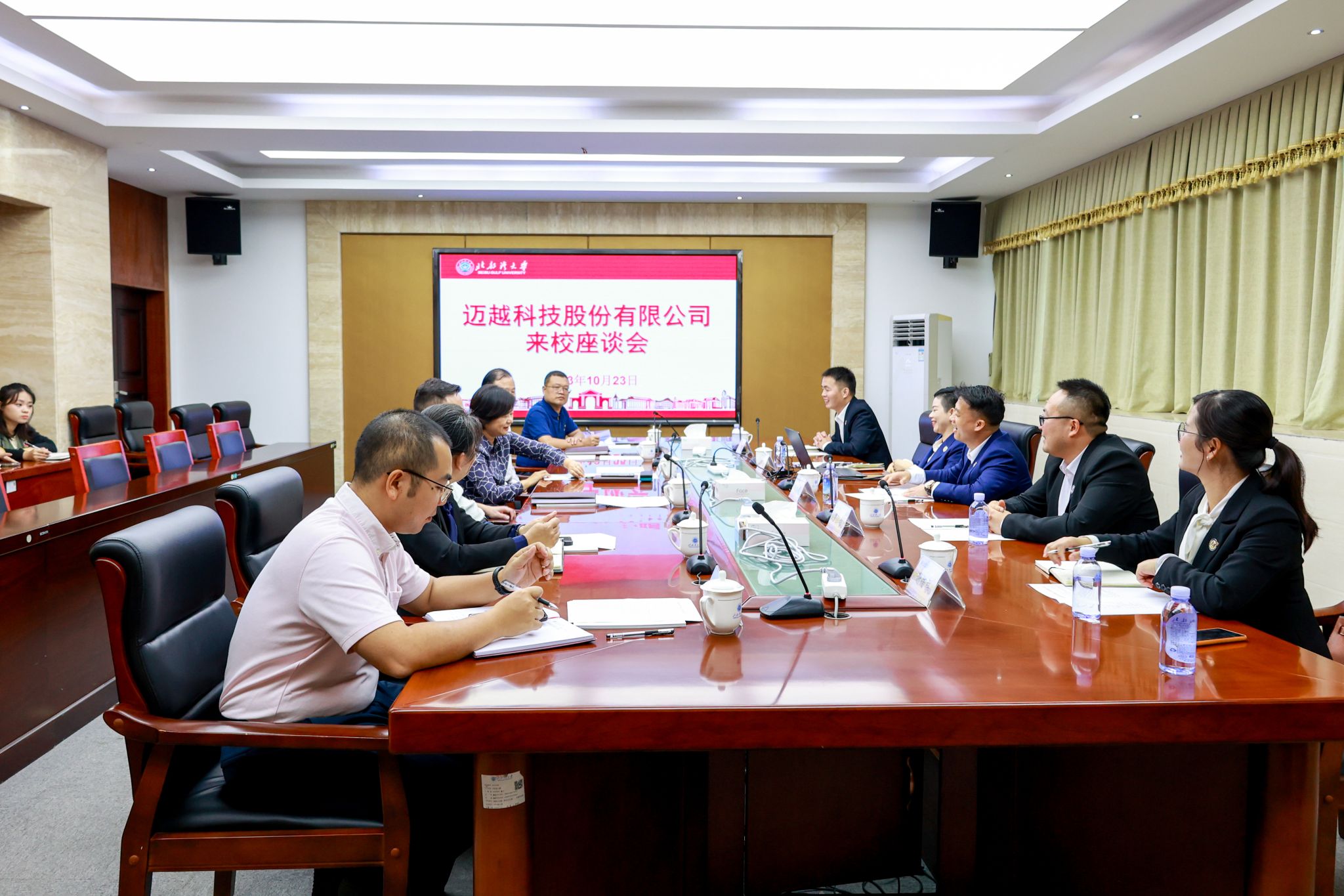 10月23日下午,迈越科技股份有限公司董事长李常青一行就校企合作、产教融合等事宜到校洽谈合作。校党委副书记、校长苗剑出席在办公楼327会议室举行的座谈会,校党委常委、副校长陈丹主持。