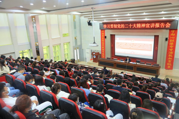 韩峻峰从“党的二十大的主题、主要成果,过去5年的工作和新时代10年的伟大变革,马克思主义中国化时代化,中国式现代化,全面建设社会主义现代化国家的目标任务,坚持党的全面领导和全面从严治党,应对风险挑战,习近平总书记参加党的二十大广西代表团讨论时的重要讲话精神等八个方面,对党的二十大精神进行了全面系统地宣讲解读。