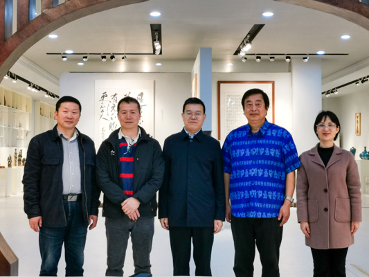 林基明校长(中)陪同吴春晖教授(右二)、陈建国教授(左二)考察陶瓷与设计学院展厅
