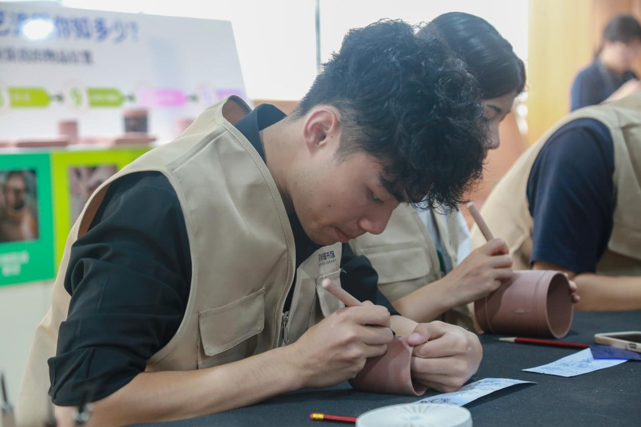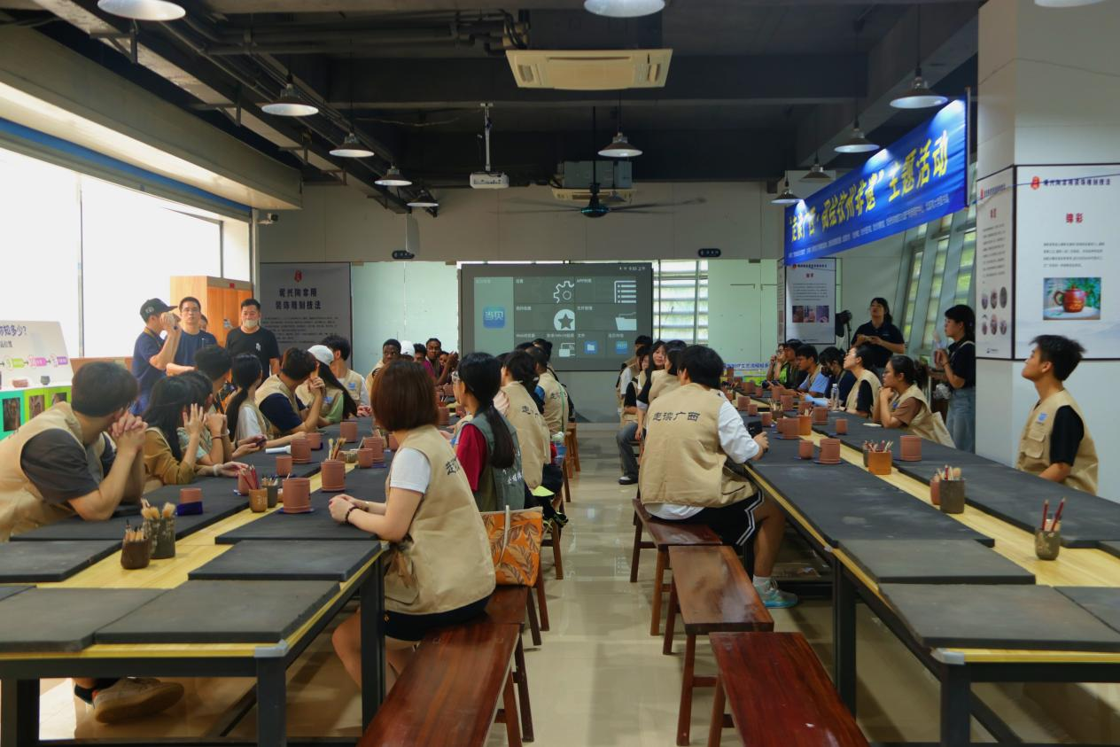 在钦州坭兴陶体验中心,同学们认真聆听老师讲解陶刻的刀法