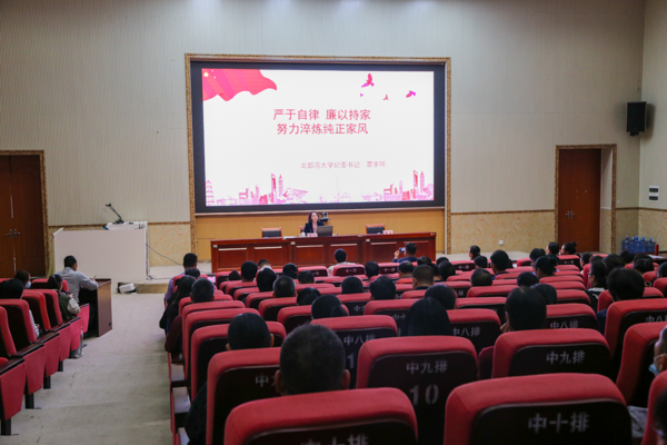 “今天我想和大家聊聊家里的事。”11月15日,在12号教学楼204报告厅举行的家庭家教家风宣讲会上,校党委常委、纪委书记覃宇环与近140名科级以上双职工干部一同聊家庭教育,谈家教心得,话家风建设。宣讲会由纪委副书记姚敏主持。
