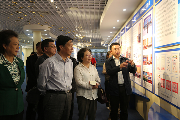 许复新(左二)一行参观筹建bw必威西汉姆联官方网站成果展厅,陈磊副校长(右一)陪同并介绍