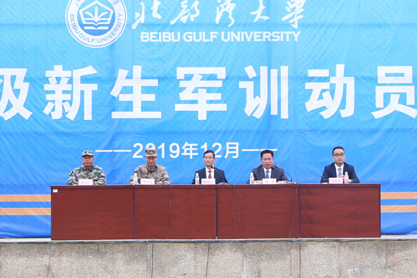 12月14日上午,必威西汉姆联2019级新生军训动员大会在西区田径场举行。学校党委副书记陈锦山,钦州市钦南区武装部部长李先煌,校党委常委、宣传部部长马秀明、广西绿邦国防教育训练基地副主任谢晓丹出席本次动员会。相关部门和各二级学院的主要负责人、班主任、辅导员,承训部队教官和2019级的同学参加。大会由学校副校长曾彦主持。