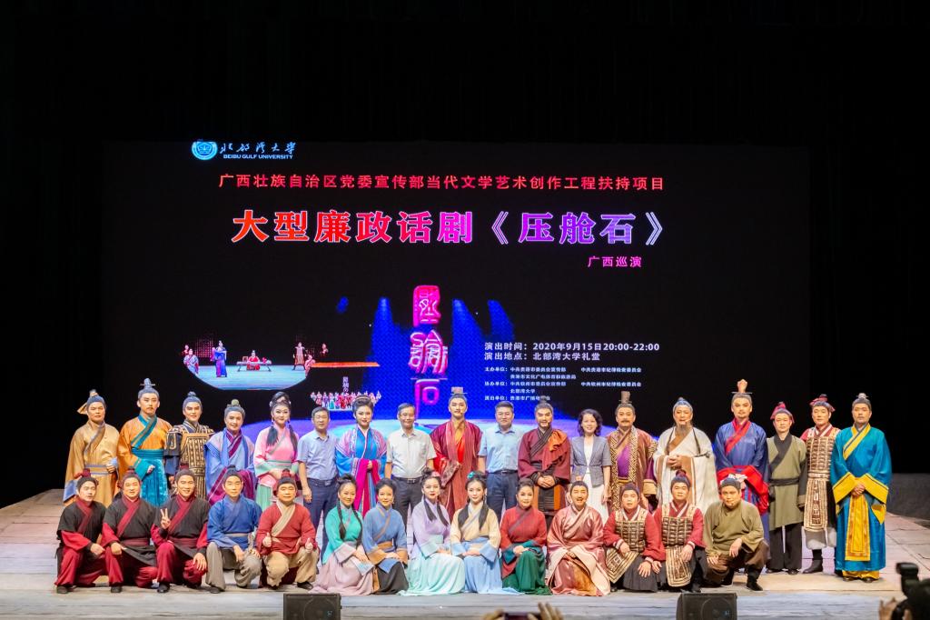 9月15日晚,bw必威西汉姆联官方网站礼堂人声鼎沸、座无虚席。由必威西汉姆联校友、2009级音乐学(舞台主持与表演)专业毕业生刘奕疆担纲主演的廉政题材大型话剧《压舱石》隆重上演。学校党委副书记陈锦山,校纪委书记覃宇环与党员师生代表及来自钦州市的观众一同观看了演出。