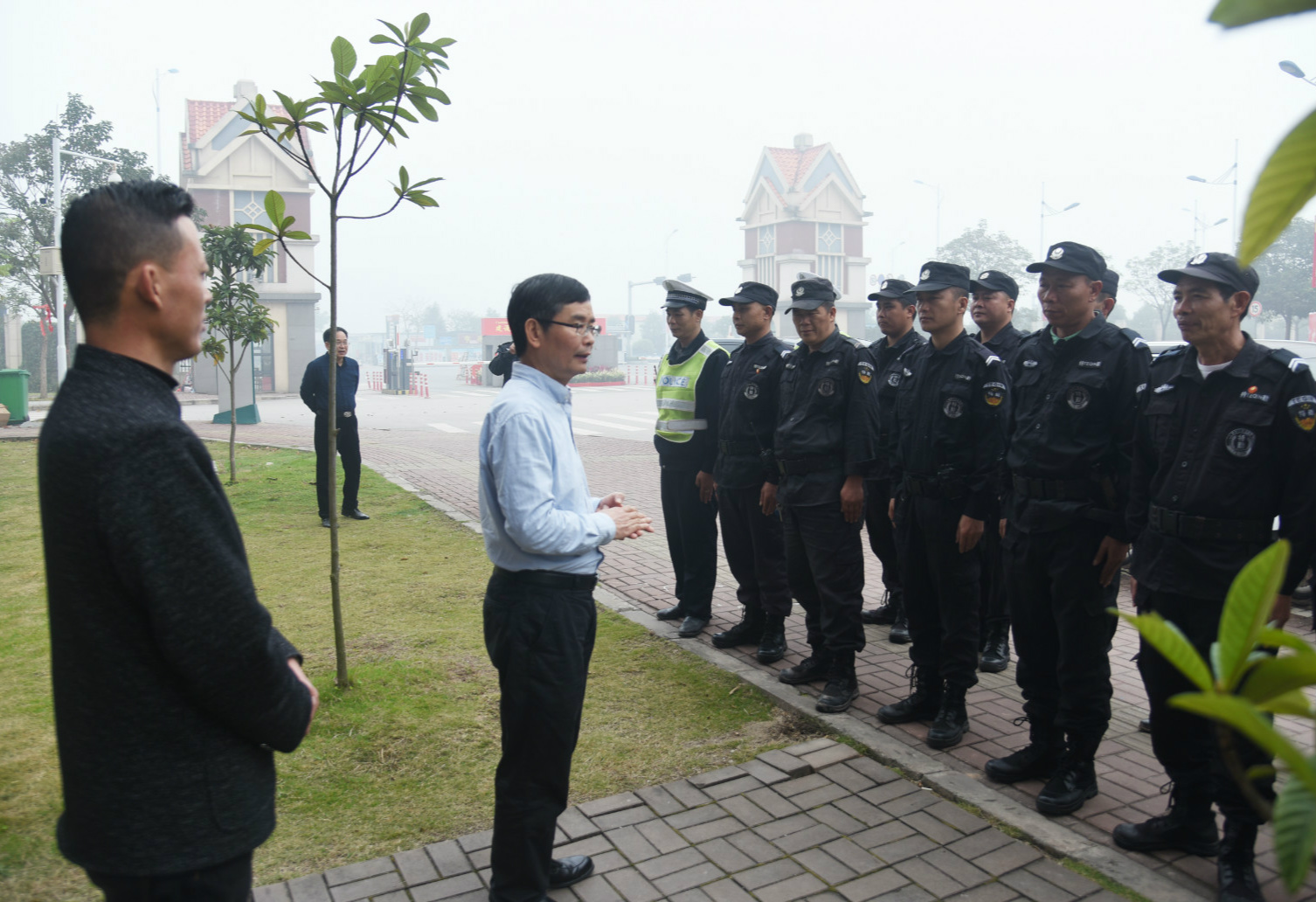 陈锦山副书记在警务室前慰问执勤人员