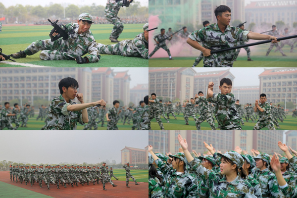 本次大会以庄严的升国旗仪式拉开序幕。分列式、持枪队、擒敌拳、匕首操、警棍术、战术连、花式方队等军事科目表演依次接受检阅。分列式方队精神抖擞,步伐整齐划一,展现着良好的精神风貌;为致敬战役英雄,本次方队特别设置了疫情方块队,深情演绎了勇赴一线救死扶伤的最美逆行者。女子持枪队铿锵有力,展示了当代女大学生巾帼不让须眉的风采。擒敌拳方块出拳有力,前出拳后避拳,以矫健身姿挥舞动作。匕首操方队以匕首展示干脆利落的动作,匕首一起一落,动作精准有力。警棍术方队挥棍而出,上挥下压,横跨迈步,气势强大。战术连手持钢枪匍匐前进、跨越障碍、跪姿射击等战术动作,仿佛置身于“绝地求生”的现场。花式方队在表演过程中呈现变化多样的队列图形,每一个图形都寓意着20级新生军训团铭记历史,吾辈自强的使命和担当。