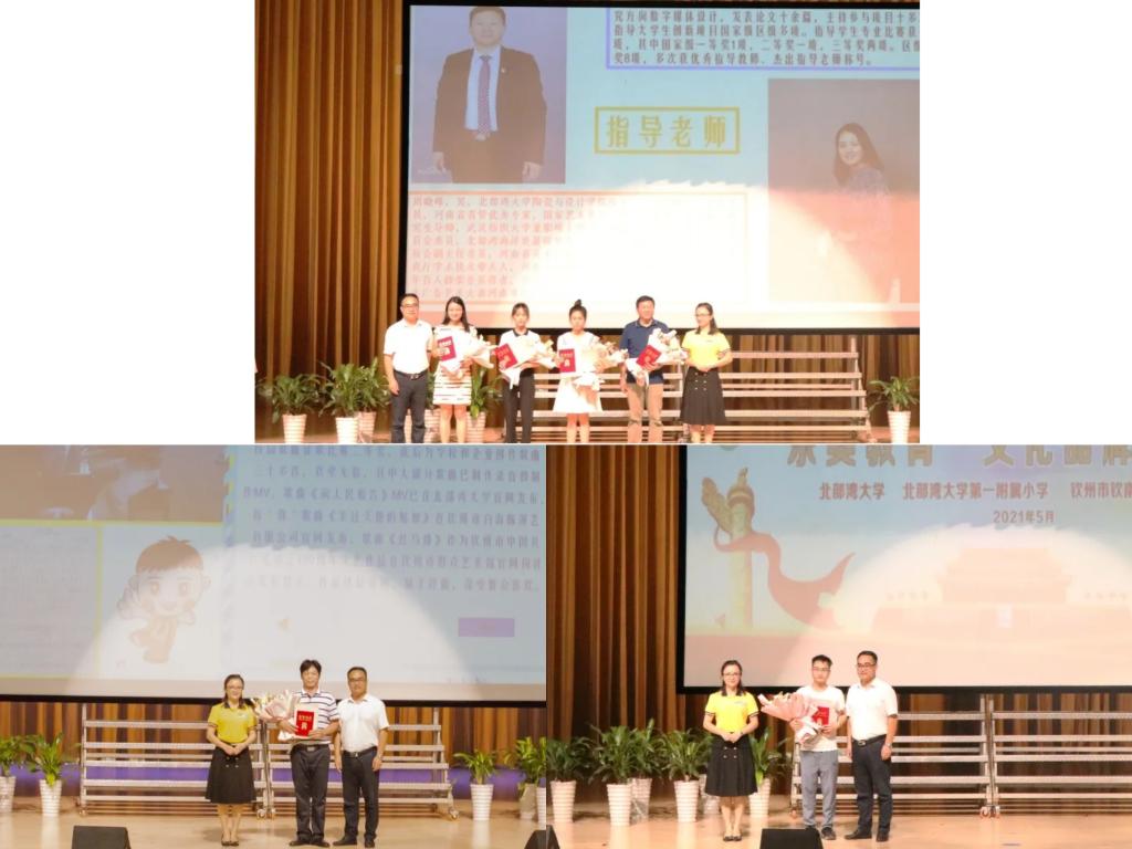 马秀明部长和bw必威西汉姆联官方网站第一附属小学校长梁春红为陶瓷与设计学院周晓峰院长,人文学院陆海平老师,陶瓷与设计学院谭小凤老师等“乐美教育”文化品牌形象设计者颁发证书。