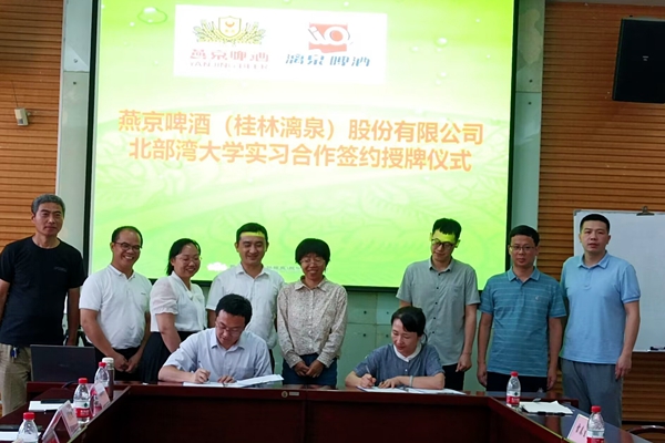 在燕京啤酒(桂林漓泉)股份有限公司,陈磊代表学校与燕京啤酒(桂林漓泉)股份有限公司签署教学实习协议,并为公司授予“bw必威西汉姆联官方网站实践教学基地”牌匾。