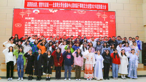 “我志愿成为湾大记者,始终牢记湾大红就是我们的底色,湾大蓝是我们的理想,马甲绿是我们的战袍。”全媒“新兵”誓言铿锵有力、掷地有声,他们坚定的眼神,昂扬的斗志感染着现场的每一个人。