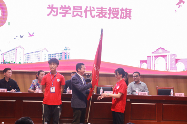 开班仪式上,陈磊为学员代表授旗,为期一年的学校“青马工程”培训班培养工程正式启动。(莫春花 周君凤 陆滨 摄)