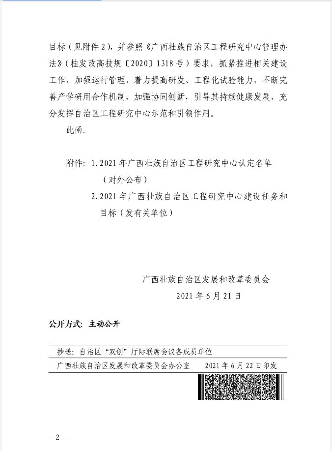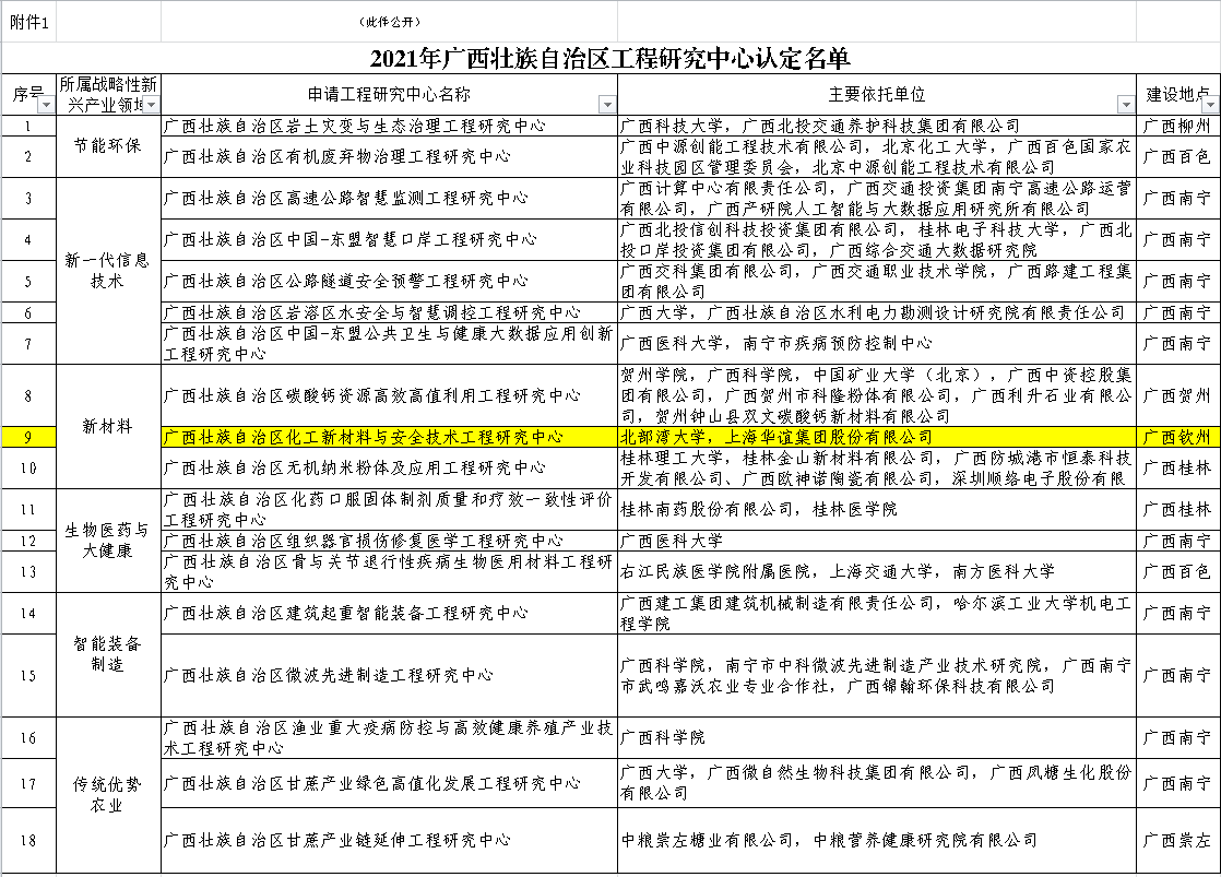 近日,广西壮族自治区发展和改革委员会下发了《广西壮族自治区发展和改革委员会关于认定2021 年度广西壮族自治区工程研究中心的函》文件,由必威西汉姆联与上海华谊集团股份有限公司牵头申报的“广西壮族自治区化工新材料与安全技术工程研究中心”获批立项建设。这是必威西汉姆联首次获批以第一单位建设的自治区工程研究中心,实现了必威西汉姆联石油与化工学院在此类科技服务及应用化平台上的历史性突破。