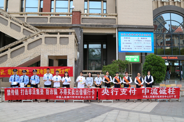 仪式前,中国人民银行钦州市中心支行、中国银联广西分公司、钦州市区农村信用联社在学校东区食堂前开展了金融安全知识宣传。(周佳俐 摄)