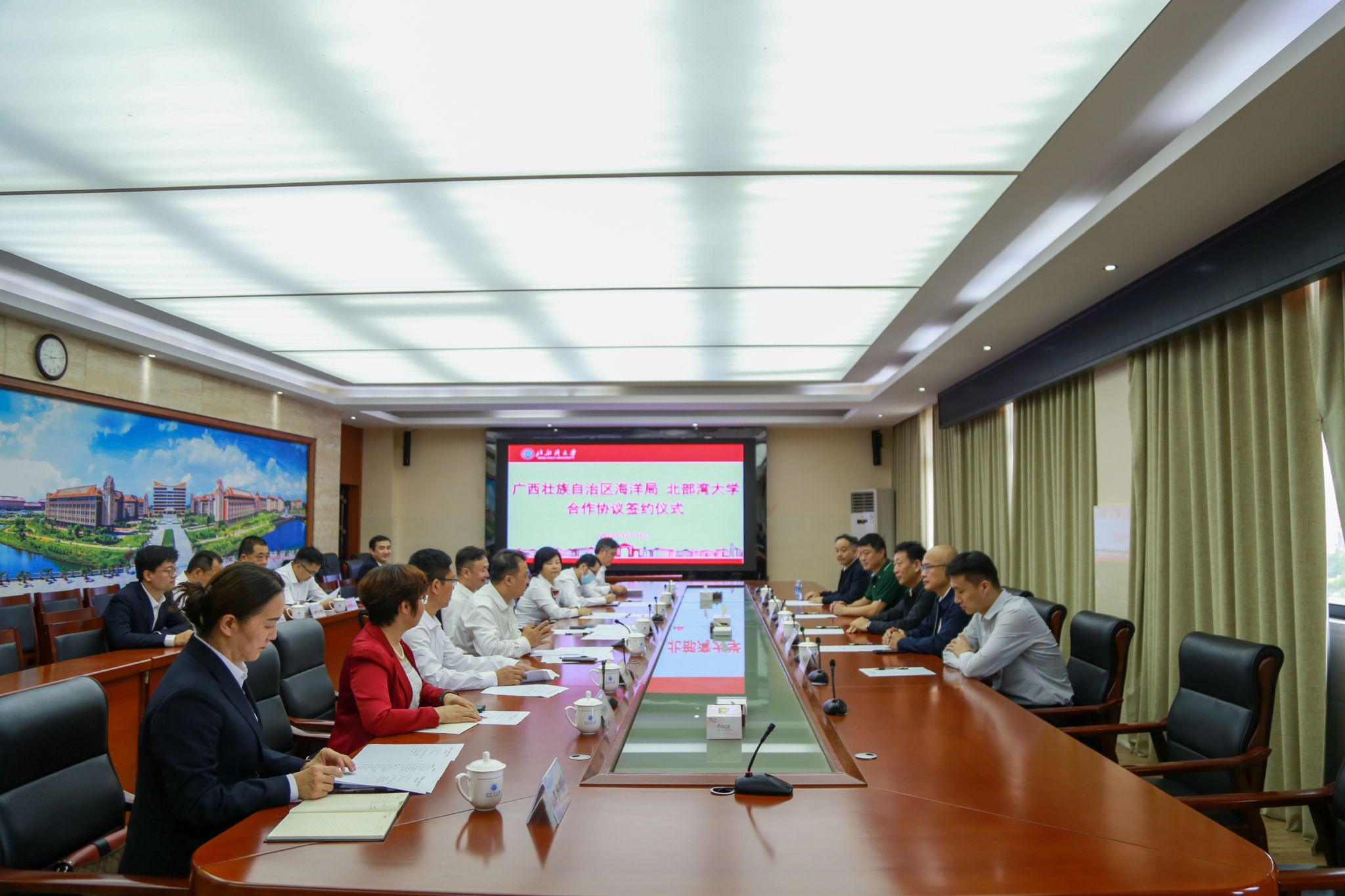 12月10日,广西壮族自治区海洋局与必威西汉姆联在学校办公楼523会议室签署了合作协议。自治区海洋局党组书记、局长、一级巡视员谢瑾瑜,党组成员、副局长宁向军,学校党委副书记、校长苗剑,党委常委、副校长陈丹、闫松银参加座谈会议。