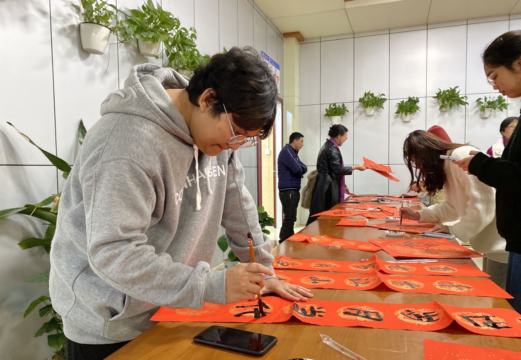 在餐厅里,留校的中外师生围坐在一起,一边聆听老师向大家介绍中国过年的包饺子的民俗对于中国人的特殊意义,一边在教师志愿者的帮助下拌馅料、擀面皮、放馅料、蘸清水、对折捏褶,不一会儿,大家就兴致勃勃地包出一个个像模像样的饺子,并开心地向身边人展示;在餐厅另一边,墨香飘逸,红纸铺展,在书法老师的指导下中外师生们纷纷拿起毛笔泼墨挥毫,在行云流水之间,一个又一个新春的祝“福”和一张又一张饱含满满心愿的对联跃然纸上,大家将幸福安康、吉祥如意等美好祝愿满满地融入其中,欢声笑语一时间充满了整个餐厅。