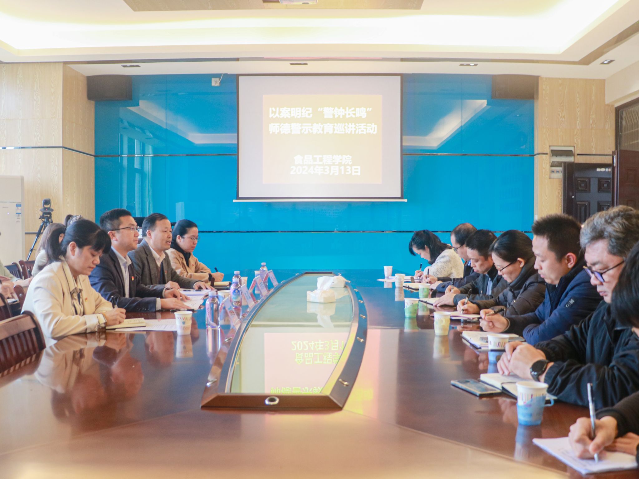 3月13日下午,校党委副书记陈磊率学校师德师风警示教育巡讲团成员到食品工程学院开展以案明纪“警钟长鸣”师德警示教育巡讲活动。巡讲活动由党委教师工作部部长朱芳阳主持,食品工程学院全体教职工参加。