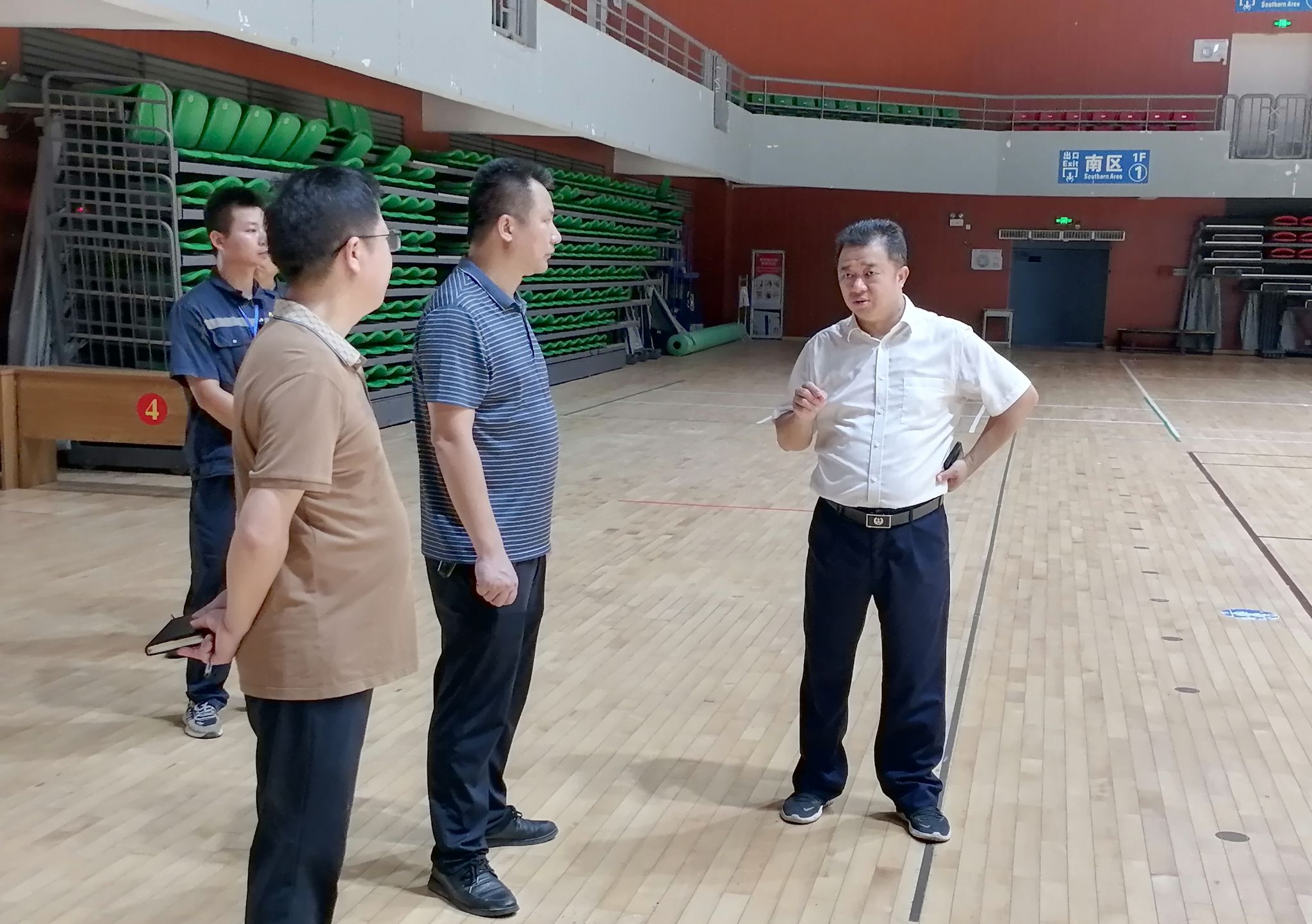 闫松银(右一)在学校体育馆排查安全问题