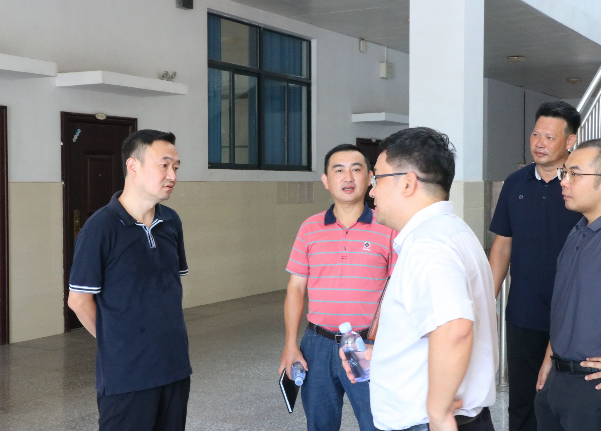 苗剑(左一)在学校公共教学楼检查安全管理工作