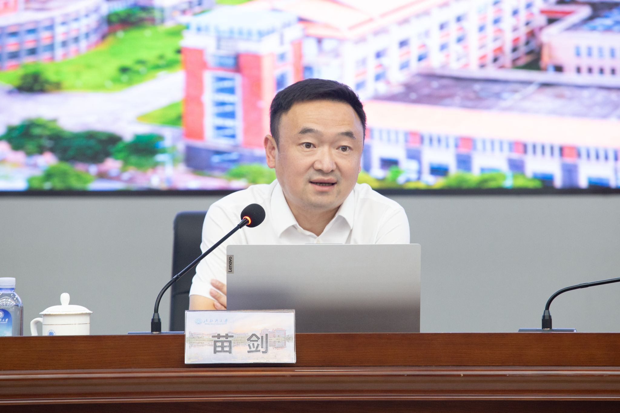 苗剑做“立足广西,面向东盟,建设海洋特色鲜明的应用型大学”主题报告。他介绍了学校办学发展面临的时代背景与机遇,深入解读了学校的办学特色,学校发展面临的新挑战,阐述了建设海洋特色鲜明的应用型大学的思考。他希望新教职工发挥湾大“三敢”精神精神特质,勇于创新,追求卓越,共同为培养优秀人才、推动学校高质量发展贡献力量。