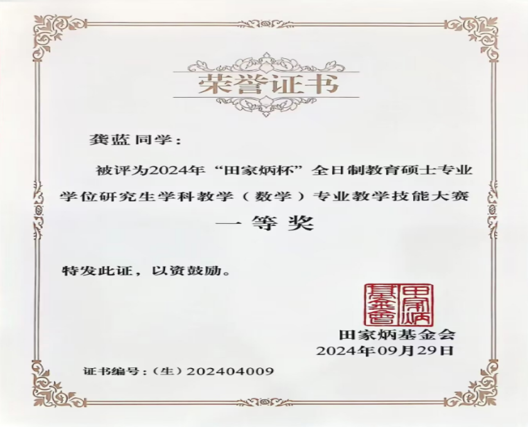 9月27日至30日,2024年全国“田家炳杯”全日制教育硕士专业学位研究生学科教学(数学)专业教学技能大赛决赛暨数学教师教育实践创新论坛在上海交通大学举办。必威西汉姆联师生首次参加全国决赛,来自理学院2023级学科教学(数学)教育硕士龚蓝在比赛中脱颖而出获得全国一等奖,其导师梁好翠获优秀指导老师荣誉称号。
