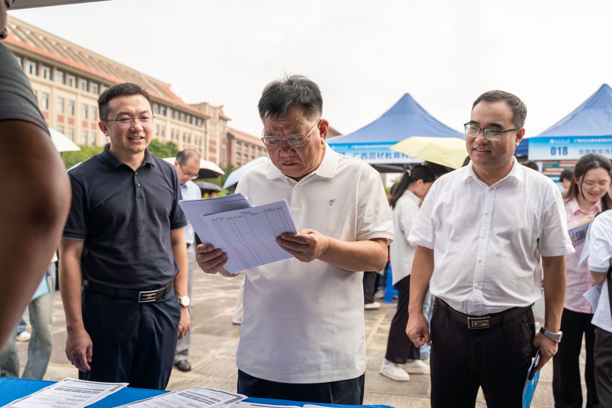 汪维处长(中)与陈磊副书记(左)、马秀明副校长(右)现场了解招聘情况
