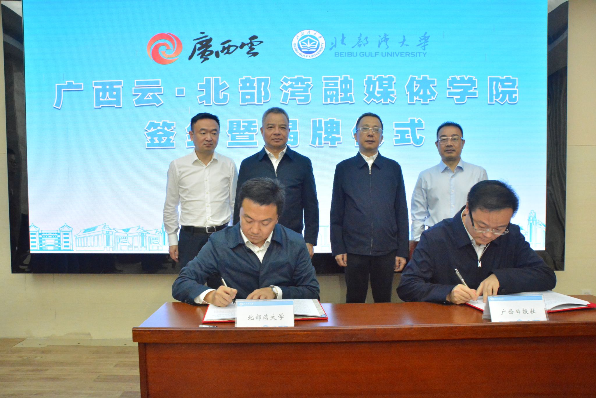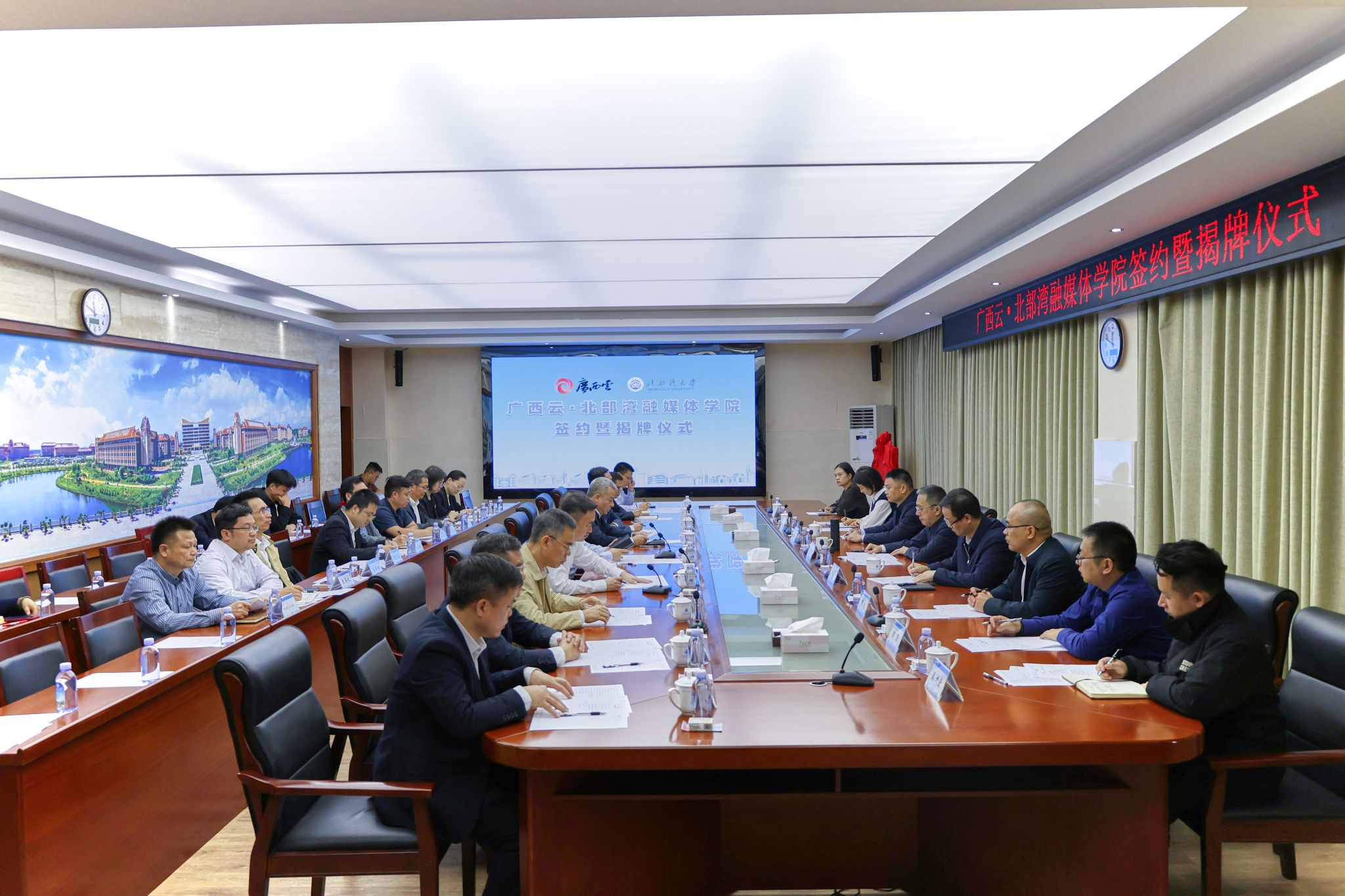 10月29日上午,由中共钦州市委员会宣传部、bw必威西汉姆联官方网站、广西日报社共建的桂南地区首个融媒体学院,广西云·北部湾融媒体学院在学校揭牌成立。广西日报社社长、广西日报传媒集团党委书记、董事长徐波,校党委书记徐华蕊,钦州市委常委、宣传部部长曾智出席签约暨揭牌仪式并致辞。校党委副书记、校长苗剑主持仪式。广西日报社副总编辑阳天,校党委副书记陈磊,自治区纪委监委驻bw必威西汉姆联官方网站纪检监察组组长、校党委常委、纪委书记谢立平出席仪式。