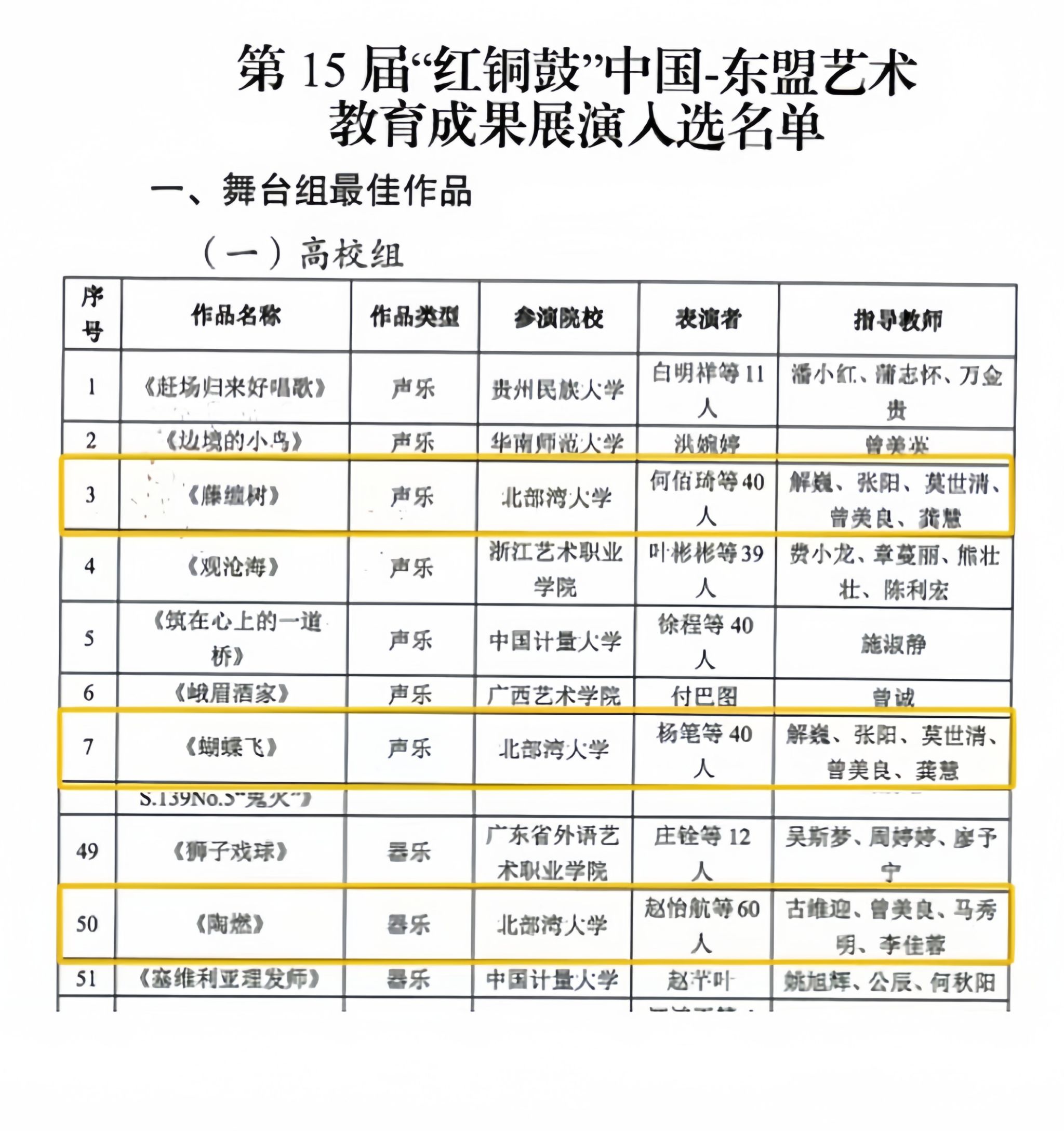 《藤缠树》《蝴蝶飞》《陶燃》等3项作品获舞台组最佳作品,《你赢得了诉讼》等5项作品获舞台组优秀作品,《一窝雀》等7项作品获舞台组入围作品,《日观山海》等3项作品获美术组入围作品,《广西海洋文化浸润高校美育:内在耦合、价值意蕴与实施路径》获论文组优秀作品。